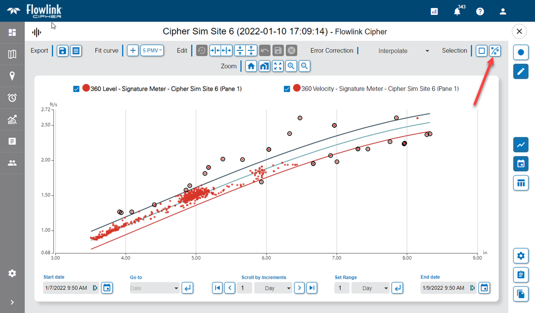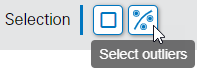 | When a scatterplot is in Edit mode, a new Select Outliers toolbar button is available. When a best fit curve has been added to a scatterplot, the Select Outliers function will select all of the points that fall outside of the curve's limit lines.