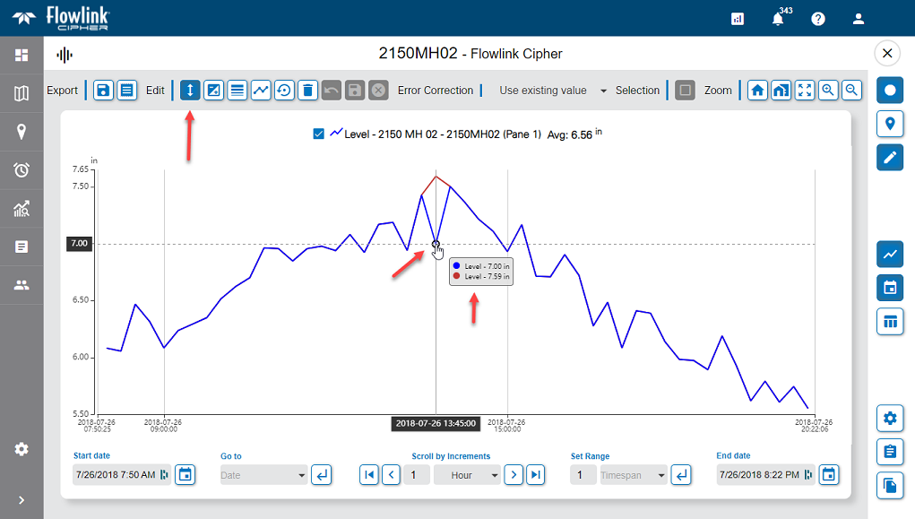 | A new Manual Edit function has been added to the Edit toolbar on the main graph screen. To use this new function: - Enter edit mode. - Select a single point. - Click the Manual Edit button. - Using the mouse, click and drag the point up or down. As the point is dragged to a new value, the cursor tooltip and the Y-axis tooltip will display the value.