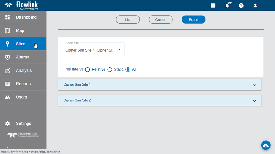 | Cipher now has a new Export tab on the Sites screen. This process allows the user to select one or more sites to export data points to a Cipher CSV file. Options are provided to select the datasets to export as well as units, precision, and the time range for the data to be exported. Each site is exported to its own CSV file. When multiple sites are exported, the CSV files are combined into a ZIP file.