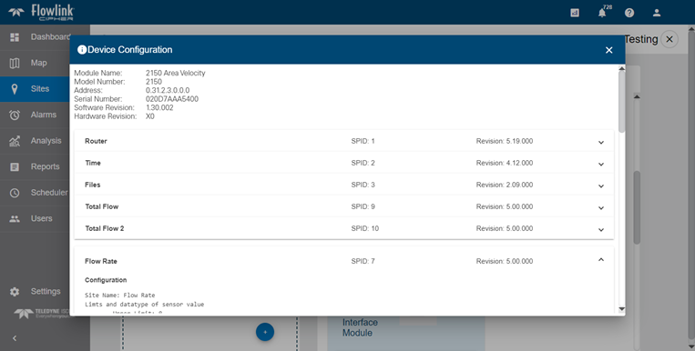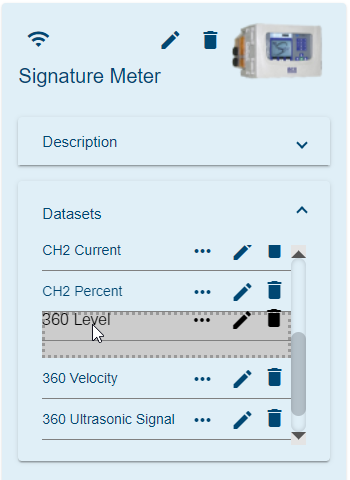 | The user can now create a preferred sorting of the datasets for each device. This is available on the device tile in the Devices tab of the site information screen. The user can drag-and-drop the datasets up and down in the list. The sort order will control which Level, Velocity and Flow Rate type datasets are automatically selected for use in the site gadget on the dashboard and in a new graph when using the Level, Velocity and Flow Rate quick graph function on the site card.