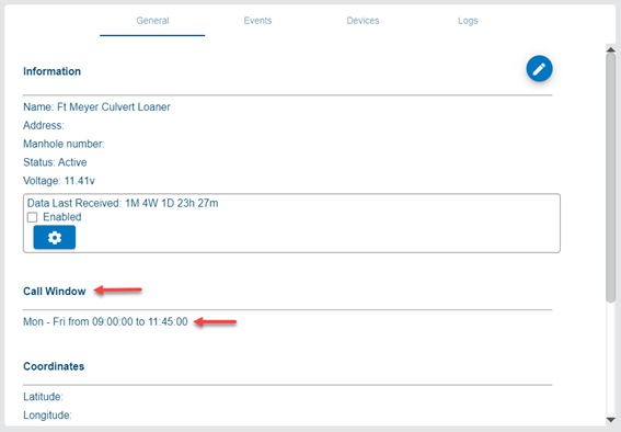 | The General tab of the site information screen now has a Call Window section. This section displays information about the next available call window configuration, or 'Not available.' if none was found.