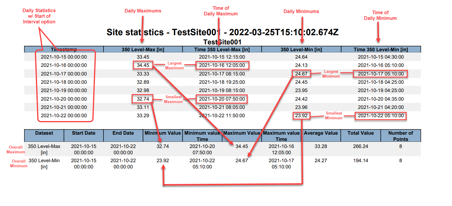 | Selecting Minimum or Maximum for a Site Statistics report will now display the specific data points for Minimum and Maximum and their timestamps within each statistical interval in the report. In the report summary the overall Minimum and Maximum values with their timestamps will also be included.