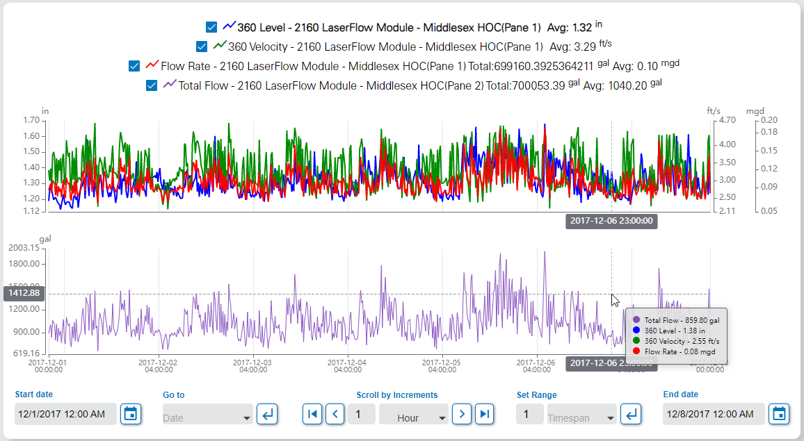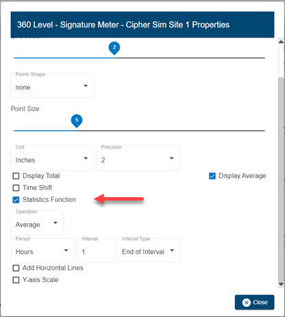 | The display properties for each dataset in a time series graph now includes an option to apply a statistics function to the data. Statistics function options include Average, Minimum, Maximum and Sum. For Flow Rate datasets, the Volume function is available instead of Sum.