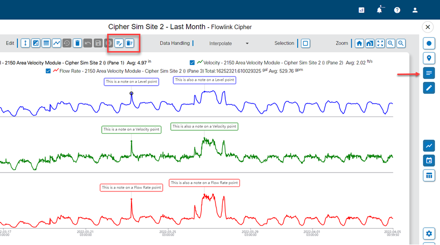 | Notes can now be added to a graph in the main graph screen. To add a note, put the graph into Edit mode, select a point and use the Add Note button on the Edit toolbar. Use the Toggle Notes button to enable the display of stored notes. Each note is attached to one point in the dataset. A point that has a note will be displayed with a diamond shape. Hovering the cursor over a point that has a note will display the note even if the Toggle Notes tool is not turned on. Notes will appear in any graph that includes the dataset to which the notes were added. When a point with a note is selected, the Edit Note and Delete Note functions can be used to change the text of an existing note or delete the note.