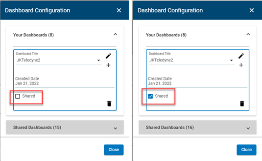 | On the Dashboard Configuration dialog box, the "Shared" check box option is now used to indicate if the dashboard is to be shared with other users.