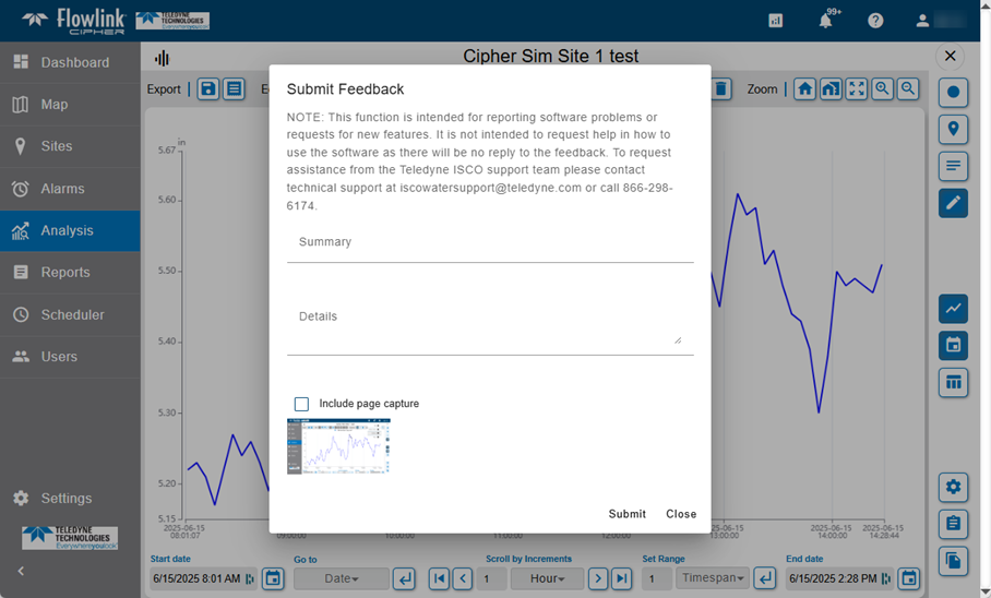| The 'Submit Feedback' function now includes a note reminding the user that the function is for reporting software problems and requests for new features. The Feedback function is not intended for obtaining help in how to use functions and procedures in Cipher. To obtain help in how to use Cipher contact Teledyne ISCO at iscowatersupport@teledyne.com or call 866-298-6174.