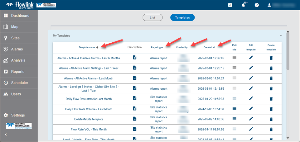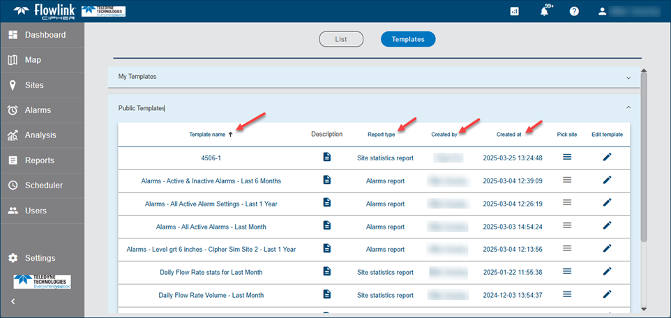 | The Reports > Templates panels for 'My Templates' and 'Public Templates' now provide sorting options for the tables of templates. To change the sort order, click the column headers for Template name, Report type, Created by, or Created at. Clicking the same heading again will switch from Ascending to Descending. The default order is Template name ascending.