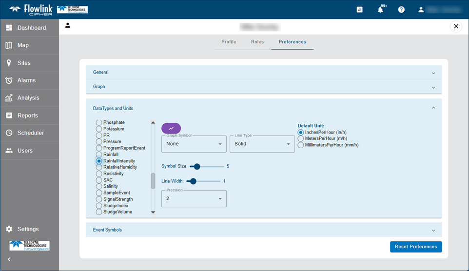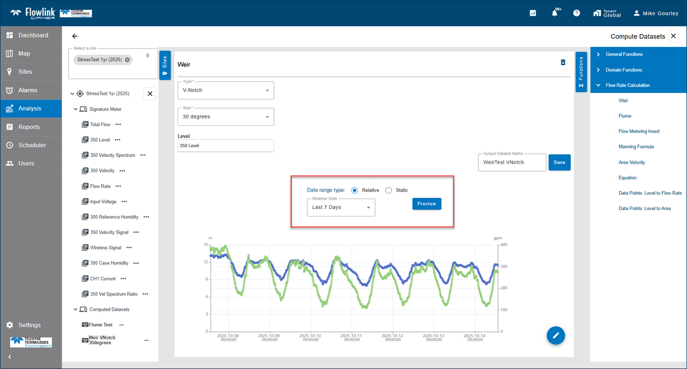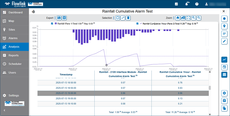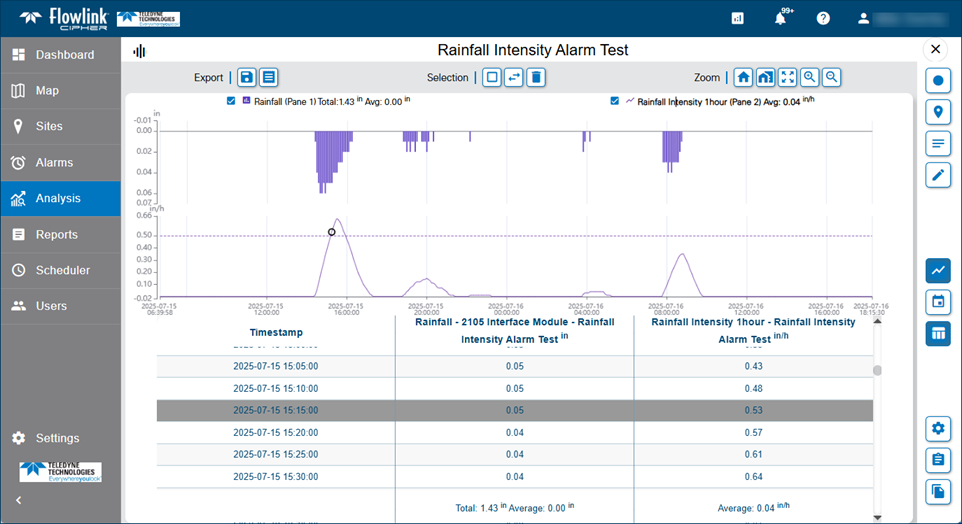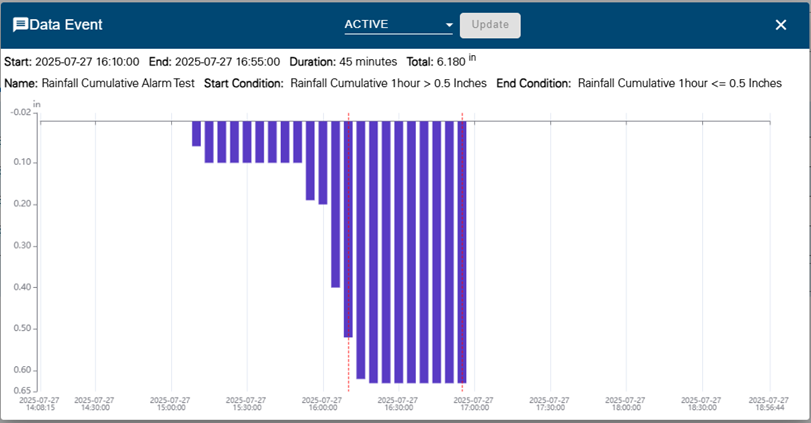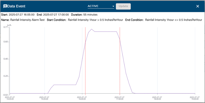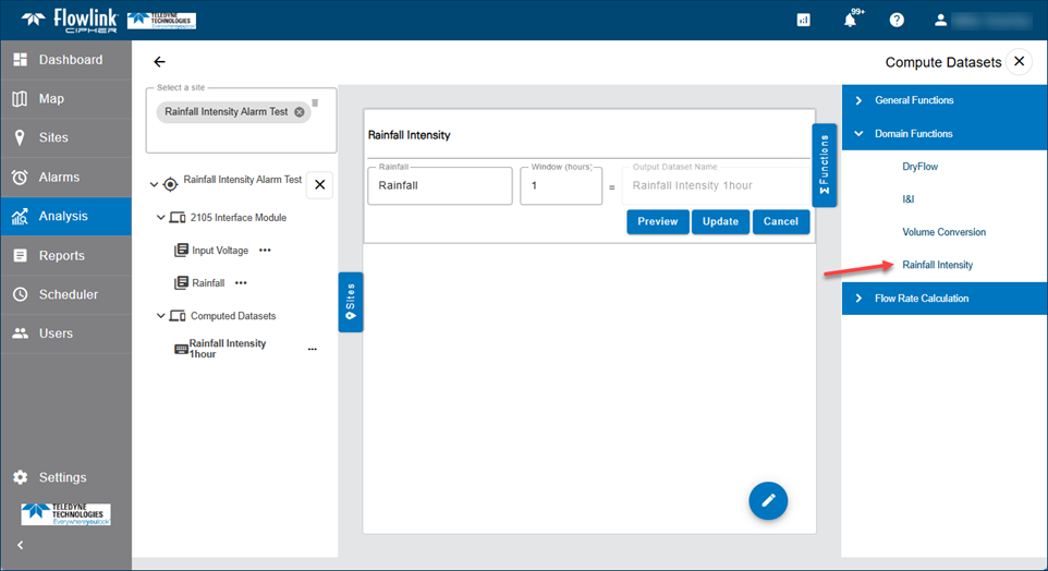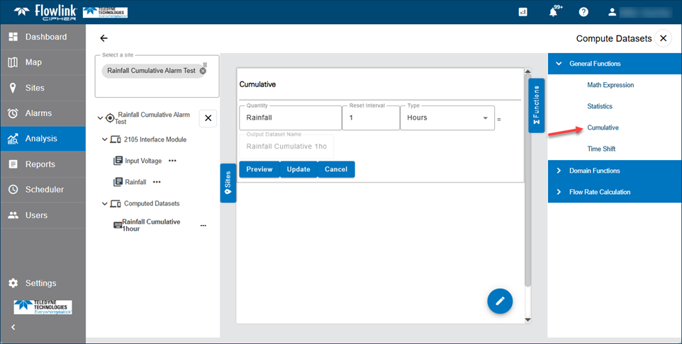 | The new Compute Dataset functions 'Rainfall Intensity' and 'Cumulative' can be used to create alarm settings to trigger data events.