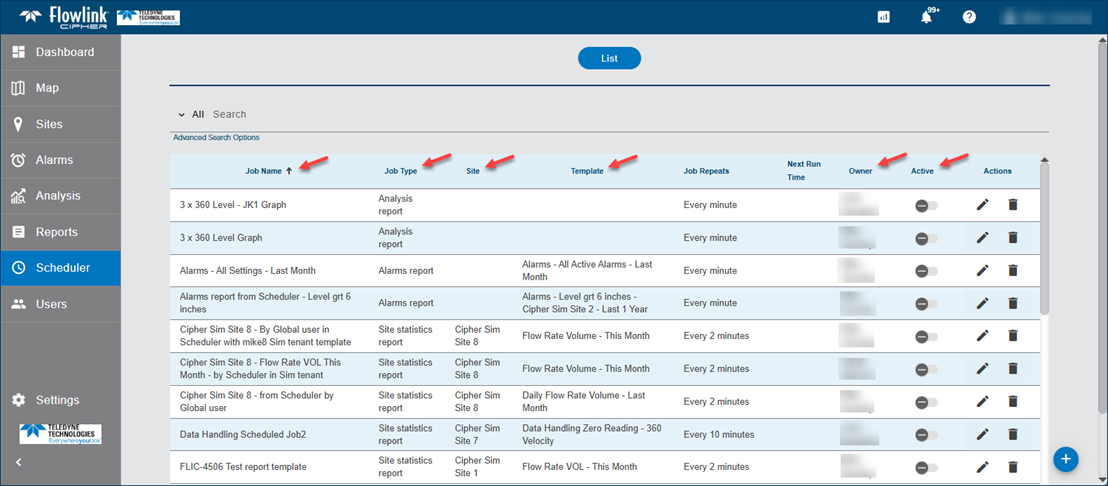 | The Scheduler table now provides sorting options. To change the sort order, click the column headers for Job Name, Job Type, Site, Template, Owner, or Active. Clicking a header a second time will also switch the order from Ascending to Descending.