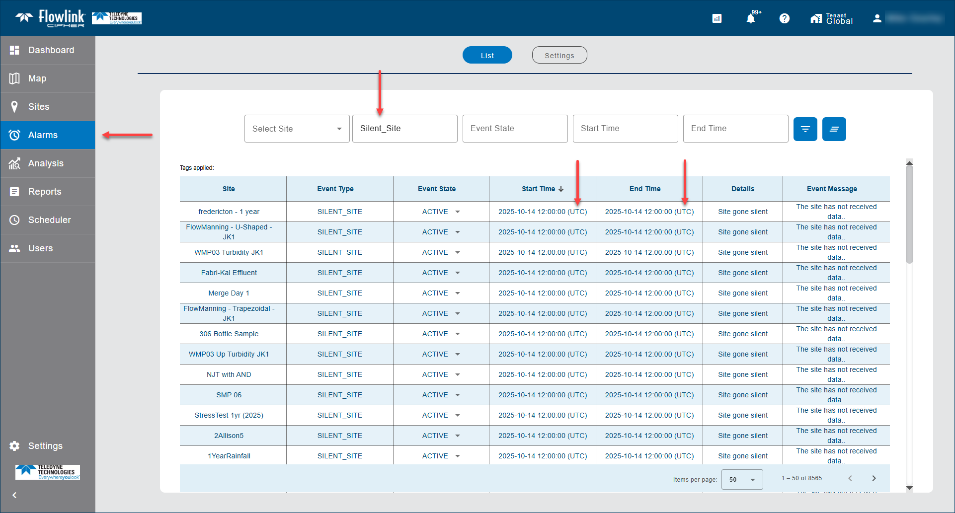 | The 'Start Time' and 'End Time' for Silent Site events are now clearly labeled as UTC timestamps. The timestamps for these events have always been UTC because they are generated by the clock of the server, which is referenced to UTC. The UTC label is visible in the Alarms screen and the Events tab of the site information screen.