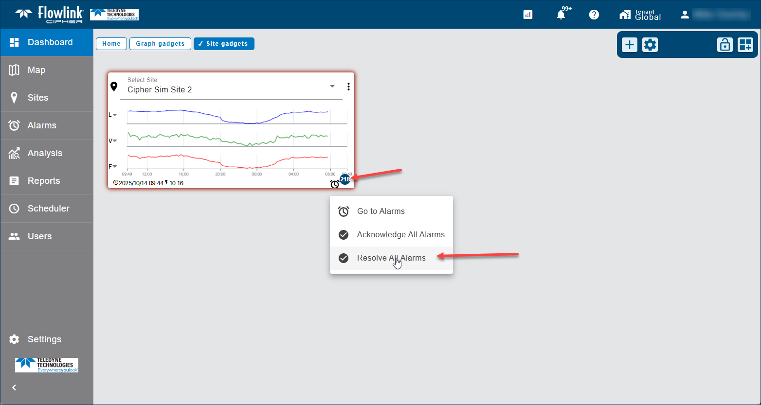 | The 'Resolve All Alarms' function has been added to the site gadget. To use this function, click the blue Alarms badge in the lower-right corner of the gadget to open the menu then select the function. This will resolve all of the alarms for the site that have been acknowledged. The alarms that are active will not be resolved as they first need to be acknowledged.