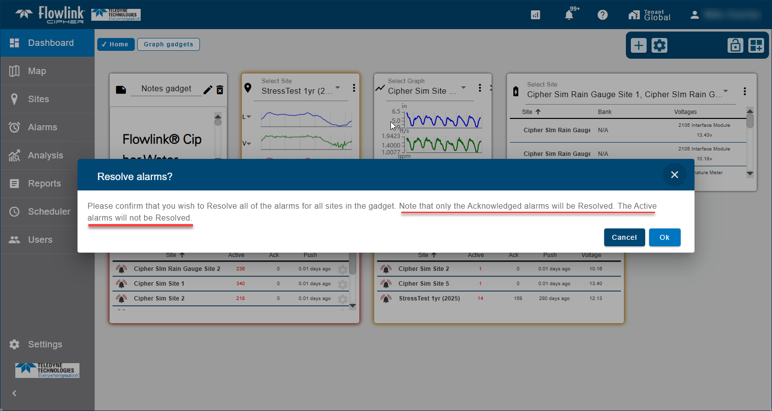 | The confirmation message triggered by the 'Resolve All Alarms' function has been updated to include a reminder that only the Acknowledged alarms will be resolved, and that Active alarms will not be resolved. This message change is applied to the Alarms and Silent Site gadgets.