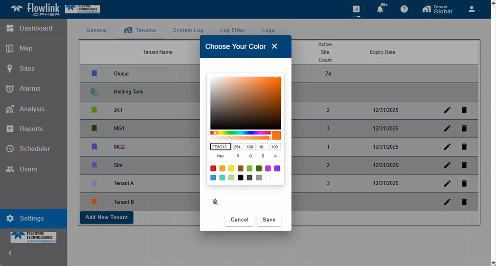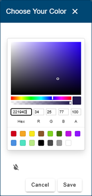 | The Settings > Tenants screen now has a new widget for selecting colors for the tenant. The widget provides RGBA and Hex color values, as well as a palette for selecting colors.