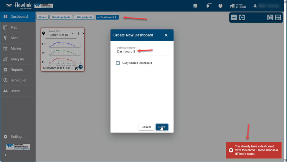 | The Create New Dashboard function now checks for duplicate dashboard names. The user is no longer able to create duplicate dashboard names.
