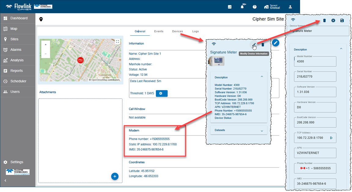 | Modem information has been added to the Device panel. New fields have been added to the Device panel: APN, Phone Number, IMEI. The APN and Phone Number fields, as well as other fields, may be populated by ingestion of the Program events. The IMEI field, like the other fields, can be manually edited. The fields related to the Modem information are then displayed on the General tab.
