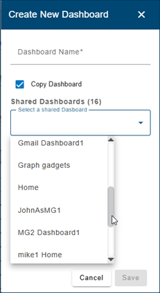 | The Shared Dashboards list in the Create New Dashboard dialog box now includes all of the users dashboards. This will allow the user to create a copy of any of their own dashboards as well as any shared dashboard from other users.