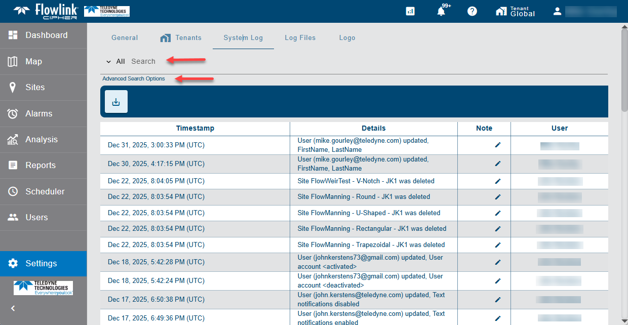 | The System Log in Settings has been updated to include new log entries and eliminate redundant entries. New System Log entries include changes to the user's profile, requests to reset the user's password, and deletion of a tenant. The System Log now also has a Search field with option's to search the Details, Notes, or User fields or All fields in the table.